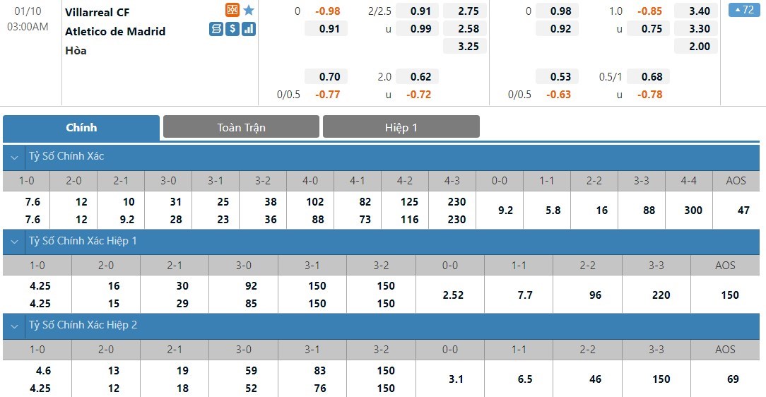 Dự đoán kèo tỷ số hiệp 1: Villarreal 0-0 Atletico Madrid