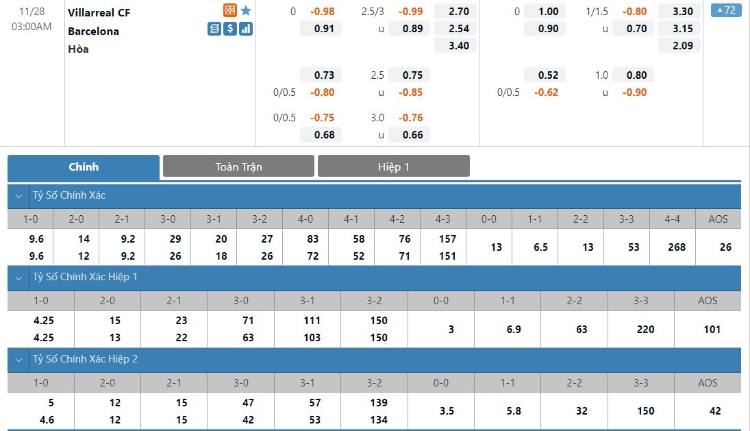 Soi kèo tài xỉu, kèo tỷ số Villarreal vs Barcelona