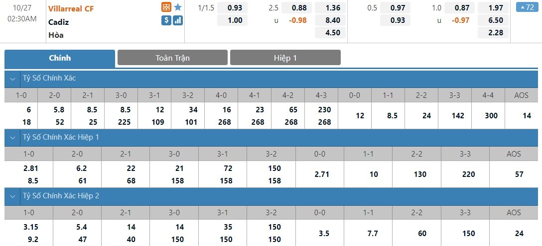 Dự đoán kèo tỷ số hiệp 1: Villarreal 0-0 Cadiz