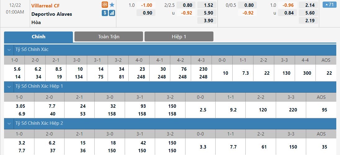 Dự đoán kèo tỷ số hiệp 1: Villarreal 2-0 Deportivo Alaves