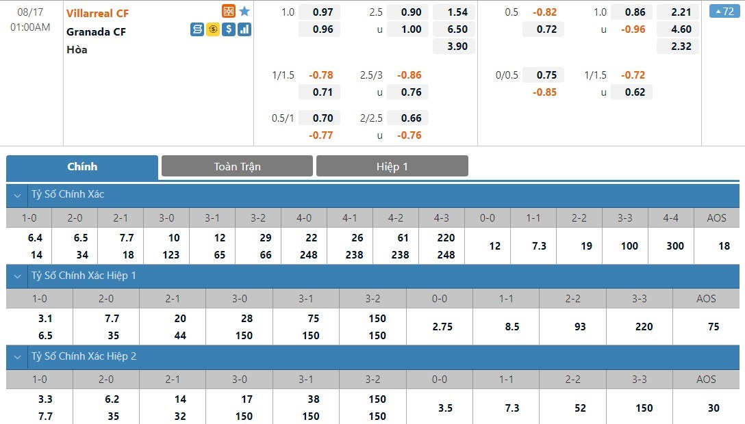 Villarreal được đánh giá cao hơn Granada rất nhiều ở kèo đấu này. Tỷ lệ cược của Villarreal chỉ là 1 ăn 1.54 trong khi đó Granada có tỷ lệ cược là 1 ăn 6.50. Tỷ số hòa có tỷ lệ cược là 1 ăn 3.90. Villarreal đang có phong độ không tốt. Trước một cái tên cũng không hề dễ chơi như Granada, Villarreal có thể sẽ gặp khó và ô cược hòa sẽ là lựa chọn cho kèo đấu này.