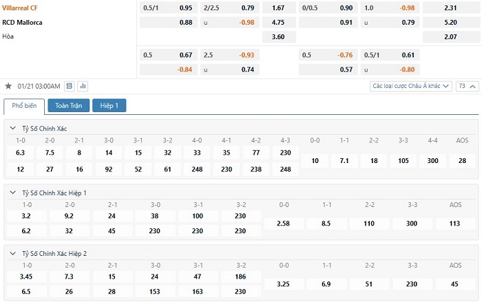 Dự đoán kèo tỷ số hiệp 1: Villarreal 1-0 Mallorca