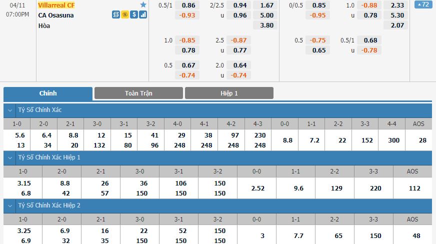 Dự đoán kèo tỷ số hiệp 1: Villarreal 2-0 Osasuna