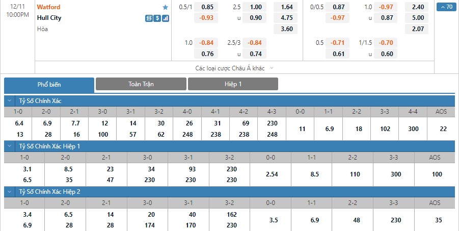 Watford được đánh giá cao hơn Hull City khá nhiều ở trận này và kết quả họ thắng trận chỉ có tỷ lệ là 1 ăn 1.64. Kết quả Hull City thắng và hòa lần lượt có các tỷ lệ lên tới 1 ăn 4.75 và 1 ăn 3.60. Phong độ của Watford ở những trận gần đây là không quá ấn tượng. Trong khi đó Hull City đang thường chơi rất khó chịu mỗi khi phải làm khách. Mạo hiểm với ô cược hòa ở kèo đấu này sẽ là một lựa chọn không quá tệ.