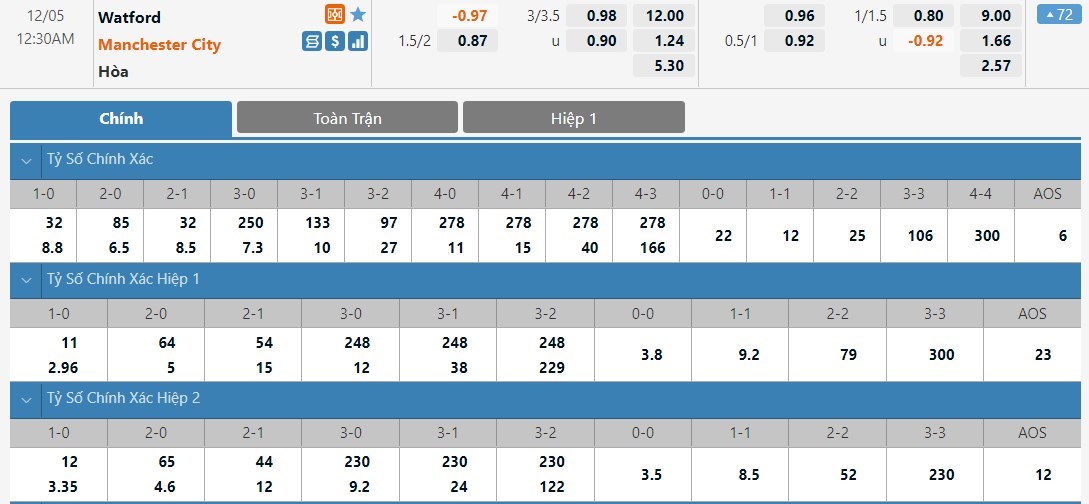 Ở vòng đấu vừa qua, Watford thủng lưới tới 4 bàn trước Leicester. Hàng thủ của Watford lúc này vẫn tỏ ra thiếu chắc chắn và họ thường phải nhận rất nhiều bàn thua trước những đối thủ mạnh. Trong khi đó Man City lúc này đang tỏ ra cực kì hiệu quả và đây là trận đấu mà họ có thể ghi được nhiều bàn. Với kèo đấu này, ô cược tài sẽ là lựa chọn được đánh giá cao hơn.