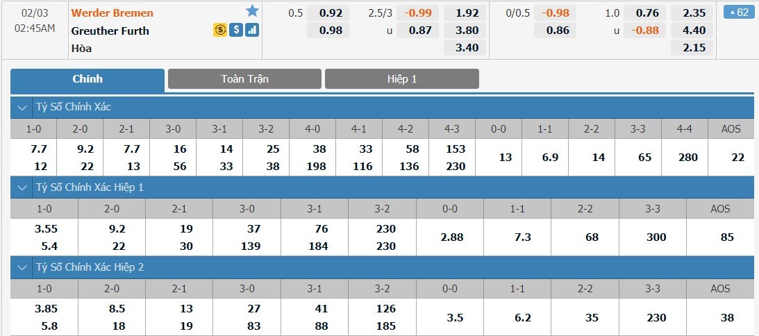 Ở 2 trận đấu gần nhất của mình, Greuther Furth đều giữ sạch lưới. Đội khách không phải cái tên quá yếu kém và họ đủ khả năng thi đấu chặt chẽ ở thời điểm hiện tại. Werder Bremen sẽ không dễ để ghi được quá nhiều bàn thắng ở trận này và với tỷ lệ tài xỉu ở mức 2 3/4 trái, ô cược xỉu sẽ là lựa chọn được đánh giá cao hơn.