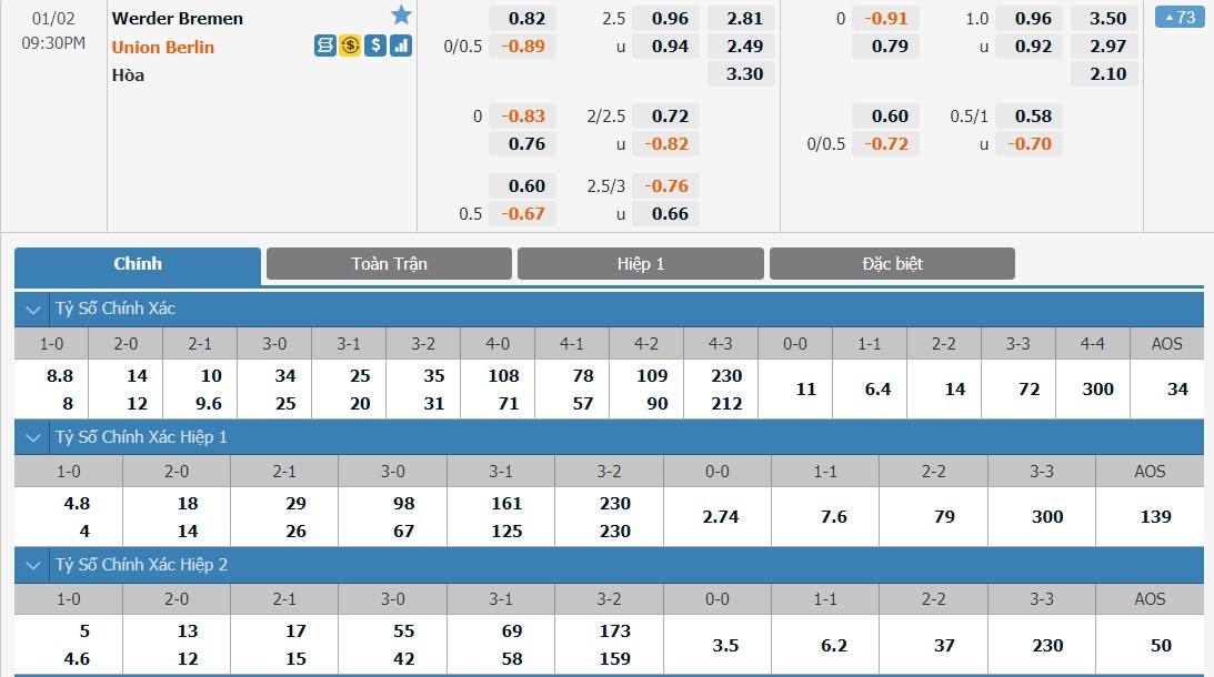 Union Berlin được đánh giá cao hơn Werder Bremen đôi chút ở trận đấu này dù họ là đội khách. Tỷ lệ cược của Union Berlin ở mức 1 ăn 2.49 trong khi Werder Bremen có tỷ lệ cược là 1 ăn 2.81. Tỷ số hòa có tỷ lệ cược là 1 ăn 3.30. Werder Bremen đang tiếp tục thi đấu nghèo nàn ở mùa giải năm nay trong khi đó Union Berlin vẫn đang có phong độ khá tốt. Với trận đấu này, Union Berlin được dự đoán sẽ là đội có 3 điểm.