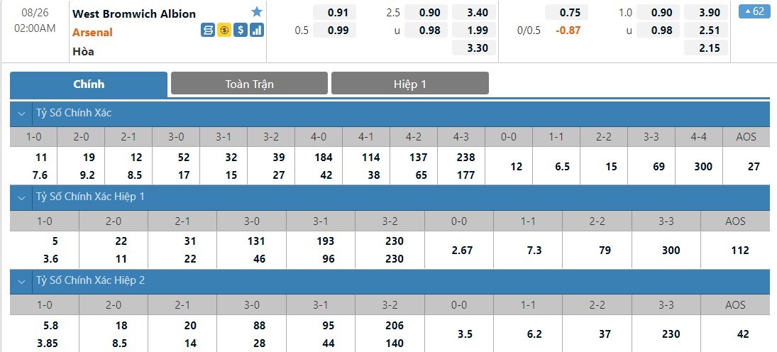 Soi kèo tài xỉu, kèo tỷ số West Brom vs Arsenal