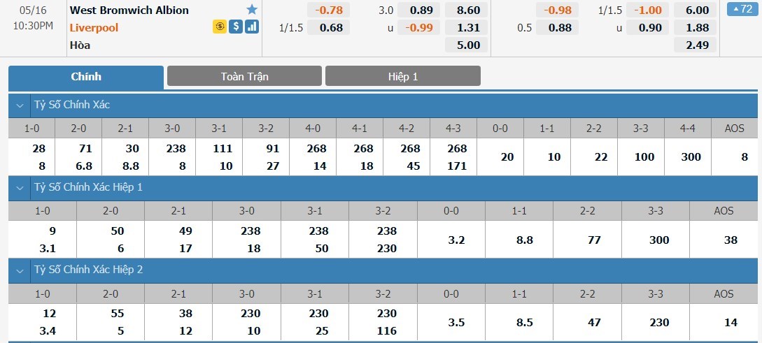 Liverpool vẫn được đánh giá cao hơn West Brom khá nhiều ở kèo đấu này. Tỷ lệ cược của Liverpool chỉ là 1 ăn 1.31 trong khi đó West Brom có tỷ lệ cược lên tới 1 ăn 8.60. Tỷ số hòa có tỷ lệ cược là 1 ăn 5.00. Liverpool dù sa sút nhưng so với West Brom họ vẫn đang có thực lực nhỉnh hơn không ít. Với đẳng cấp của mình, Liverpool được dự đoán vẫn sẽ có 3 điểm ở trận này.