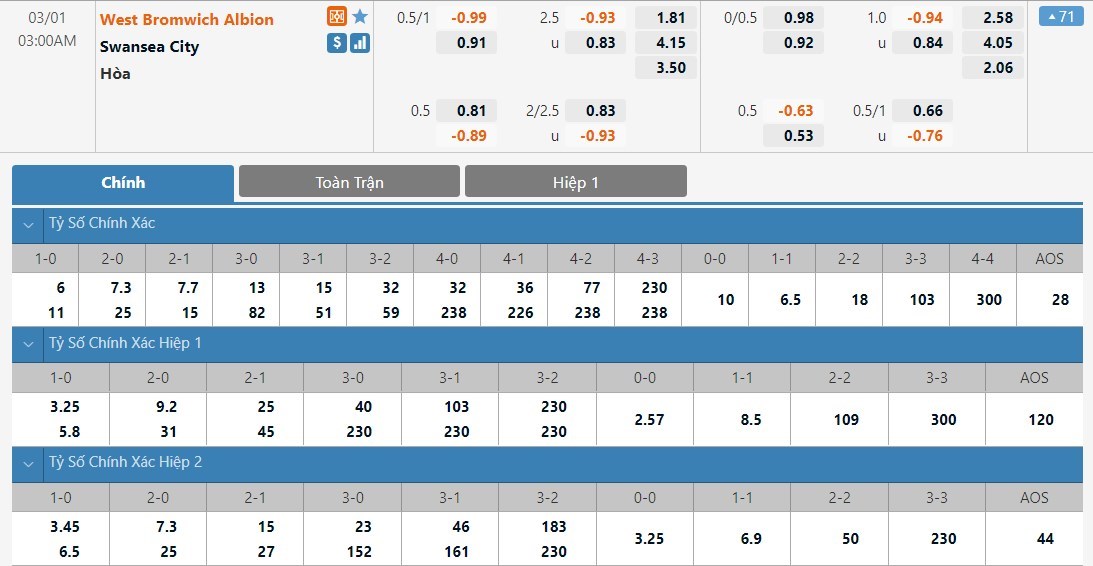 West Brom vẫn sẽ được đánh giá cao hơn Swansea không ít ở trận này. Tỷ lệ cược của West Brom chỉ là 1 ăn 1.81 trong khi đó Swansea có tỷ lệ cược lên tới 1 ăn 4.15. Tỷ số hòa có tỷ lệ cược là 1 ăn 3.50. West Brom đang có phong độ rất tệ và trước một đối thủ đang sa sút, Swansea được dự đoán sẽ đủ khả năng để kiếm được 1 điểm ở trận này.