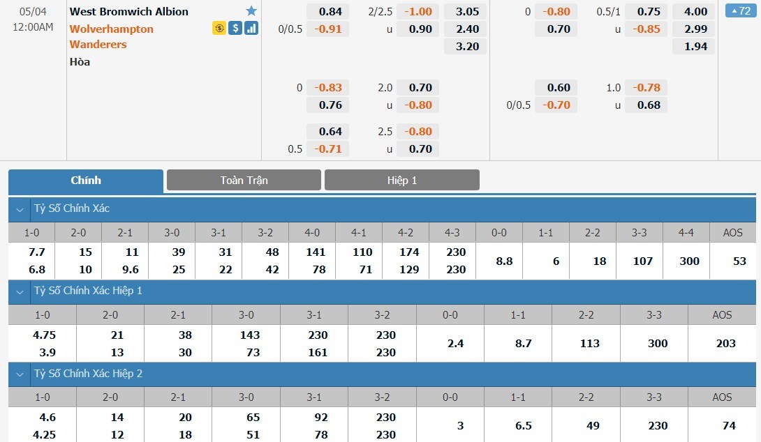 Wolverhamton vẫn được đánh giá cao hơn West Brom đôi chút ở trận này. Đội khách có tỷ lệ cược là 1 ăn 2.40 trong khi đó đội chủ nhà có tỷ lệ cược là 1 ăn 3.05. Tỷ số hòa có tỷ lệ cược cao nhất với 1 ăn 3.20. Wolverhampton đang có phong độ không tốt. Phải làm khách trước một West Brom vẫn đang rất khát điểm để nuôi hi vọng trụ hạng, Wolverhampton nhiều khả năng sẽ phải chấp nhận 1 kết quả hòa ở trận này.