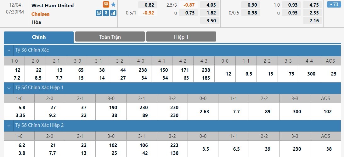 Chelsea vẫn sẽ được đánh giá cao hơn West Ham khá nhiều ở trận này dù họ là đội phải làm khách. Tỷ lệ cược của Chelsea chỉ là 1 ăn 1.82 trong khi đó West Ham có tỷ lệ cược là 1 ăn 4.05. Tỷ số hòa có tỷ lệ cược là 1 ăn 3.50. West Ham lúc này đang có phong độ không tốt. Phải đón tiếp đội đầu bảng Chelsea rất mạnh, West Ham sẽ khó có điểm ở trận này.