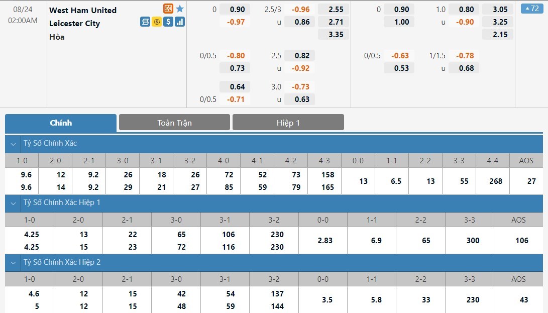 Soi kèo tài xỉu, kèo tỷ số West Ham United vs Leicester City