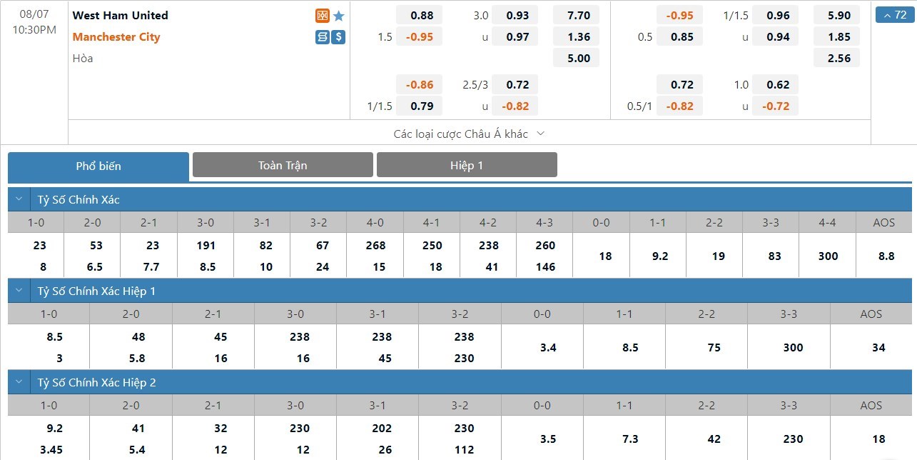 Sẽ là quá khó cho West Ham khi mà họ phải đối đầu với Man City ở ngay vòng đấu đầu tiên của mùa giải năm nay. Man City lúc này vẫn sở hữu một lối chơi quá áp lực với những đội bóng còn lại của giải đấu và West Ham sẽ khó chống đỡ lại được sức mạnh của nhà ĐKVĐ. Phong độ của Man City lúc này cũng đang là khá tốt. Họ chỉ thi đấu 2 trận giao hữu ở mùa hè năm nay nhưng toàn thắng cả 2. Trong khi đó bản thân West Ham lại đang có phong độ không tốt. Họ đang phải trải qua chuỗi 3 trận liên tiếp chỉ toàn hòa và thua dù đối thủ của họ đều là những cái tên không quá đáng ngại. Đây sẽ là trận đấu mà Man City sẽ áp đảo hoàn toàn và cửa cược Man City sẽ là lựa chọn cho kèo đấu này.