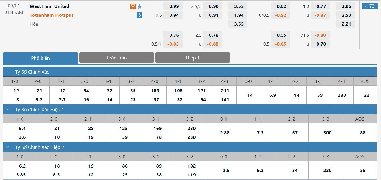 Tottenham dù phải làm khách nhưng vẫn sẽ là cửa trên ở trận này. Kết quả Tottenham thắng trận có tỷ lệ cược là 1 ăn 1.94 trong khi đó kết quả West Ham thắng trận có tỷ lệ cược là 1 ăn 3.55. 1 ăn 3.55 cũng là tỷ lệ cược giành cho tỷ số hòa. West Ham không phải một đội bóng yếu và họ đang cho thấy dấu hiệu trở lại. Đây là lúc mà West Ham đang không quá lép vế trước Tottenham và ô cược hòa sẽ là lựa chọn hợp lý.