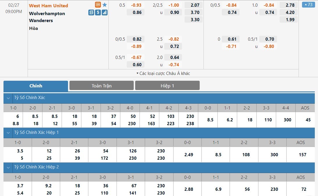 West Ham được dự đoán sẽ có một trận đấu rất khó khăn. Hàng công của West Ham lúc này không còn quá sắc sảo và đón tiếp một Wolverhampton thi đấu cực kì khó chịu, West Ham sẽ khó thắng ở trận này. Phong độ của West Ham cũng đang là không tốt khi mà họ đều hòa ở liên tiếp 2 trận gần đây. Trong 6 trận gần nhất, West Ham cũng chỉ thắng được đúng 1 trận (tính trong 90 phút thi đấu chính thức). Trong khi đó Wolverhampton đang có phong độ cao. Ở liên tiếp 2 vòng đấu gần đây, Wolverhampton đều thắng dù đối thủ của họ là những cái tên có trình độ cao như Tottenham hay Leicester. Ở trận lượt đi của 2 đội mùa này, Wolverhampton thậm chí đã đánh bại West Ham với tỷ số 1-0. Được chấp 1/2 trái, cửa dưới Wolverhampton sẽ là lựa chọn cho kèo đấu này.