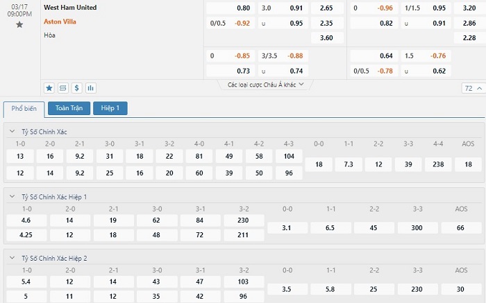 Soi kèo châu Á West Ham vs Aston Villa