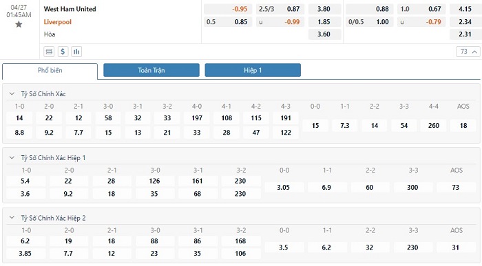 Trong 5 trận đấu gần nhất trên mọi đấu trường, West Ham đã mang về cho mình 9 pha lập công cùng với 9 lần phải vào lưới nhặt bóng. Bên kia chiến tuyến, Liverpool đã sở hữu 12 bàn thắng, còn lại là việc hàng thủ đã phải nhận 9 bàn thua. Trong 5 trận đấu gần nhất hai đội bóng này đối đầu nhau trực tiếp thì đã có 3 trận đấu kết thúc với tổng số bàn thắng từ 3 trên lên. Các nhà đầu tư nên tin tưởng vào khả năng nổ Tài ở cuộc đối đầu này với tỷ lệ tài xỉu là 2 3/4 trái.