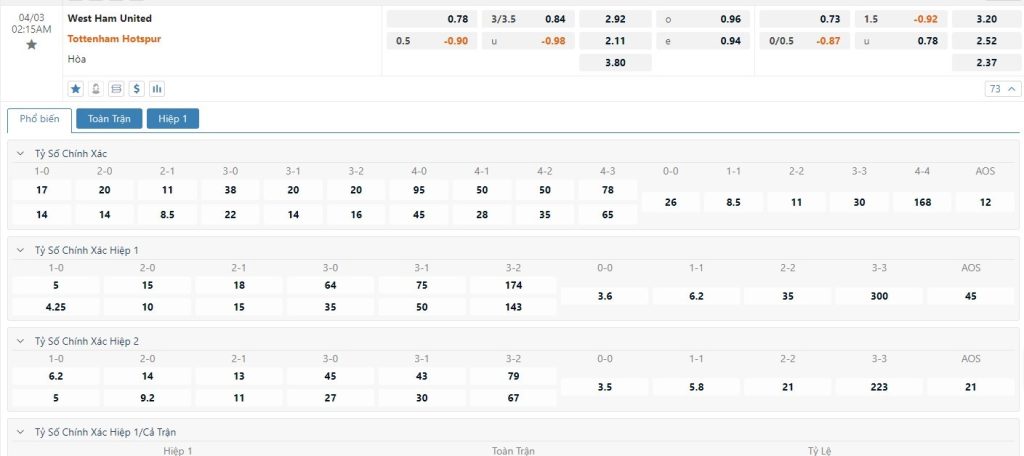 Tỷ lệ kèo ở cuộc đối đầu này là -1/2 trái nghiêng về Tottenham và tỷ lệ này là không có gì phải bàn cãi quá nhiều vào thời điểm hiện tại. Ở 5 lần gần nhất đối đầu nhau thì sự cân bằng đang được thể hiện khi mỗi đội đều mang về 2 thắng lợi, còn lại là 1 trận hòa. Cần biết rằng, West Ham đang sở hữu thành tích bất bại trong 4 trận sân nhà gần đây. Do đó, các nhà đầu tư nên tin tưởng vào đội chủ nhà ở trận này để mang về cơ hội thắng kèo cao hơn.