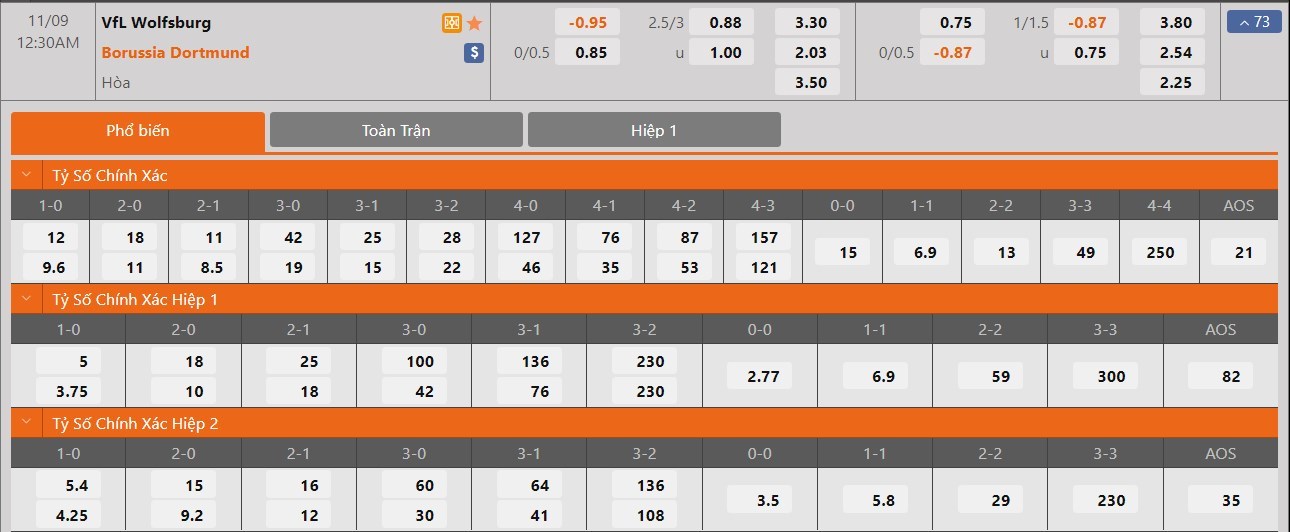 Dự đoán kèo tỷ số hiệp 1: Wolfsburg 0-2 Borussia Dortmund