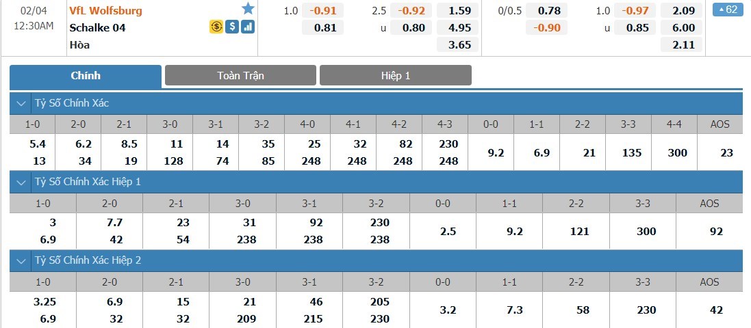 Dự đoán kèo tỷ số hiệp 1: Wolfsburg 2-0 Schalke 04