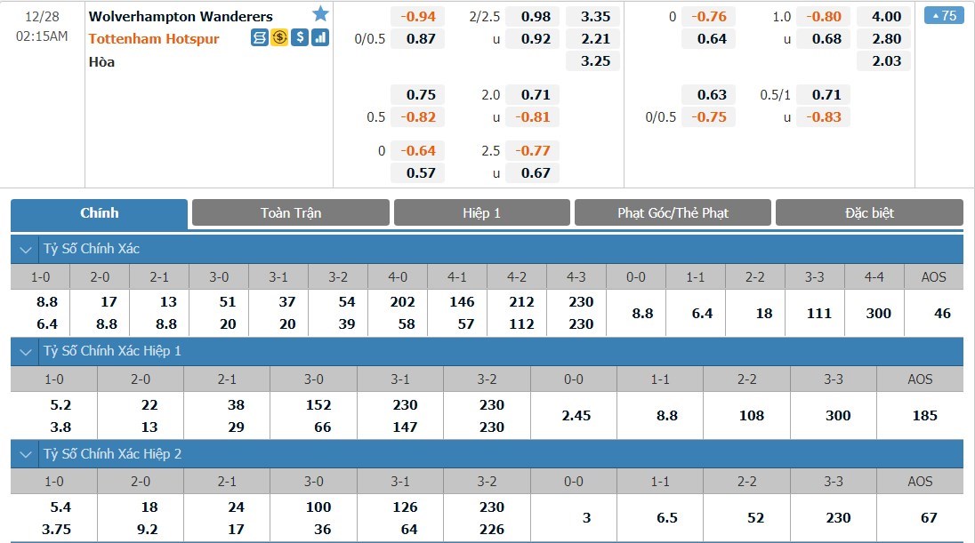 Soi kèo châu Á Wolverhampton vs Tottenham Hotspur