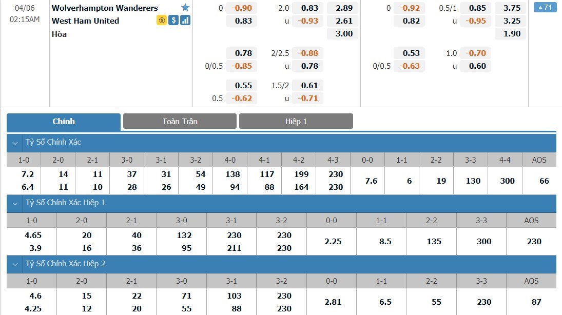Soi kèo châu Á Wolverhampton vs West Ham United