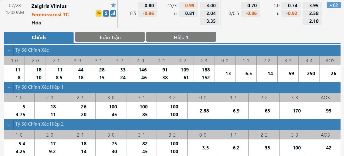 Soi kèo tài xỉu, kèo tỷ số Zalgiris Vilnius vs Ferencvaros