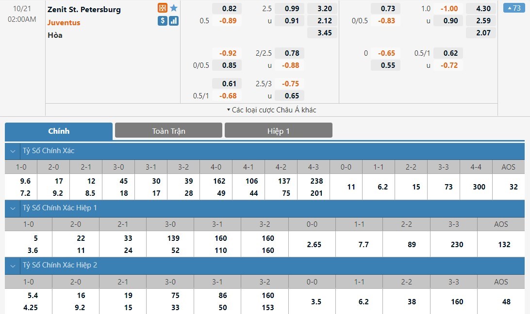 Zenit lúc này đang có phong độ không tốt. Ở liên tiếp 2 vòng đấu gần nhất của giải VĐQG Nga, Zenit đều chỉ toàn thua. Với phong độ như hiện tại và còn phải đón tiếp một đối thủ nhỉnh hơn cả về trình độ lẫn đẳng cấp, Zenit sẽ rất khó để làm nên chuyện. Đây là lúc mà Juventus đang thi đấu khởi sắc hơn và họ đang có chuỗi 4 trận thắng liên tiếp. Trước một đối thủ không quá khó chịu, Juventus vẫn có thể sẽ có 1 trận đấu tốt. Đây là kèo đấu mà Juventus không phải chấp quá sâu và với tỷ lệ chấp chỉ ở mức 1/2 trái, cửa trên Juventus sẽ là lựa chọn được đánh giá cao ở kèo đấu này.