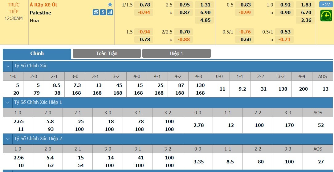 Tip kèo tỷ số hiệp 1: Ả Rập Saudi 0-0 Palestine