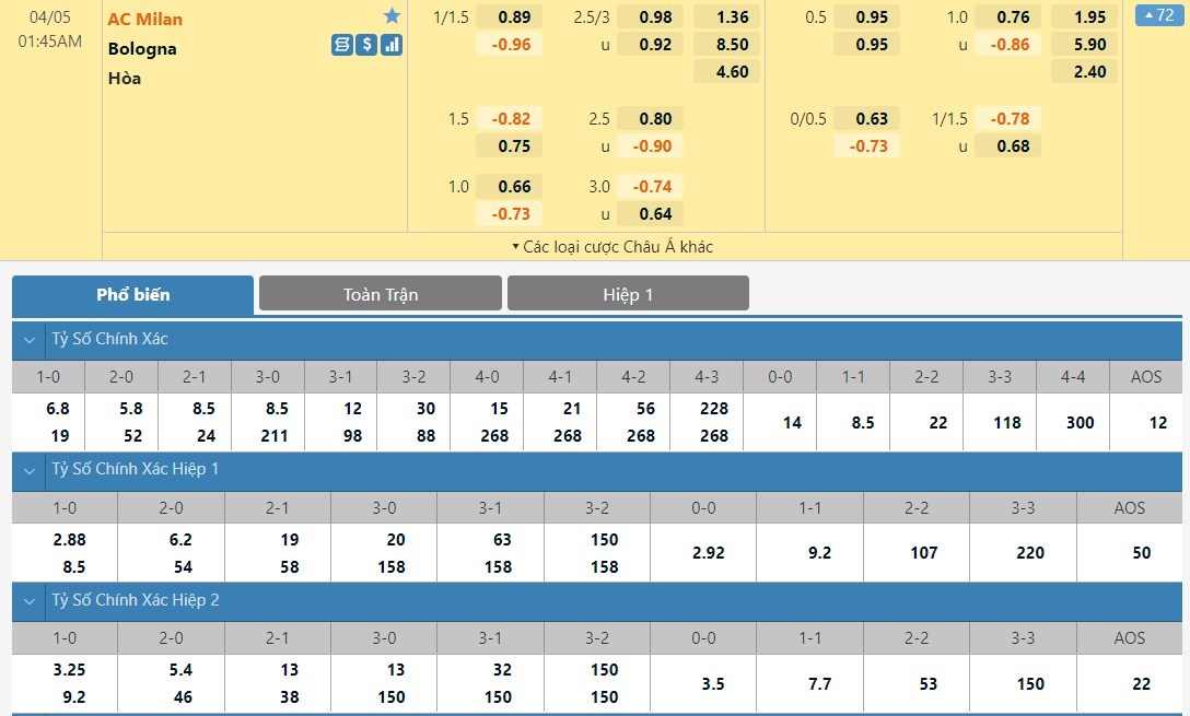 Tip kèo tỷ số hiệp 1: AC Milan 2-0 Bologna