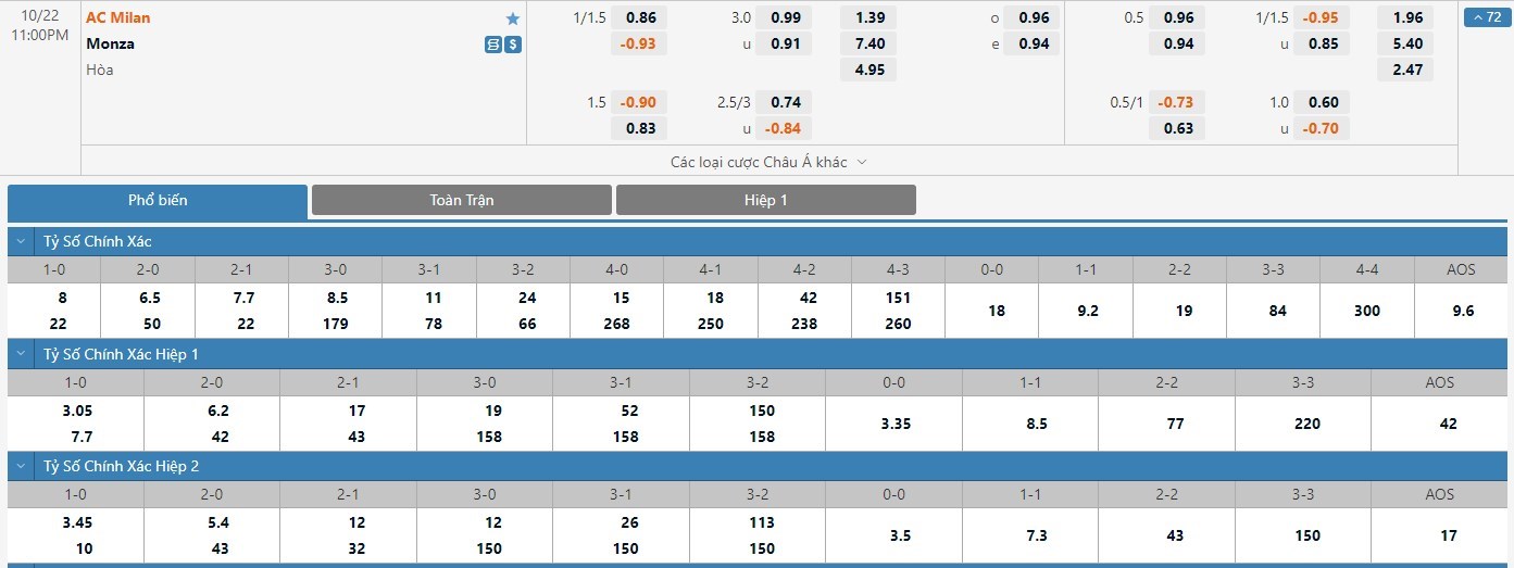 Trong 5 trận đấu gần nhất, nếu như AC Milan đã có 2 trận đấu mang về được cho mình ít nhất là 1 bàn thắng trong hiệp đấu đầu tiên thì Monza đã có 3 lần nào làm được điều này trong 45 phút đầu tiên. Với tỷ lệ kèo hiệp 1 ở trận đấu này được đưa ra là -1/2 trái thì người chơi nên tin tưởng vào đội chủ nhà trận này.