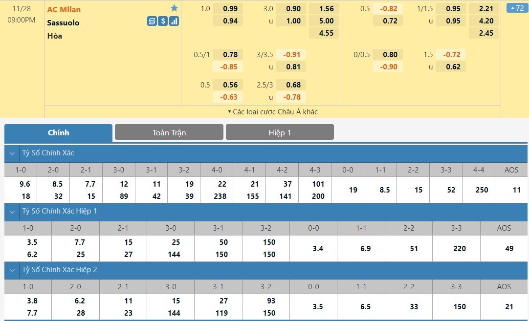 Sassuolo khả năng cao sẽ chủ động đá phòng ngự để cầm chừng trên sân khách, trong khi đó Milan cũng không thường tấn công quá rát ở quãng thời gian đầu. Kèo hiệp 1 được dự đoán sẽ kết thúc với tỉ số 0-0 cho đôi bên. Giới chủ kèo đặt ra mức chấp 0.5 bàn cho hiệp đấu này, chọn cửa dưới Sassuolo là hoàn toàn hợp lý.
