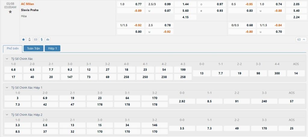 Tip kèo tỷ số hiệp 1: AC Milan 1-0 Slavia Praha