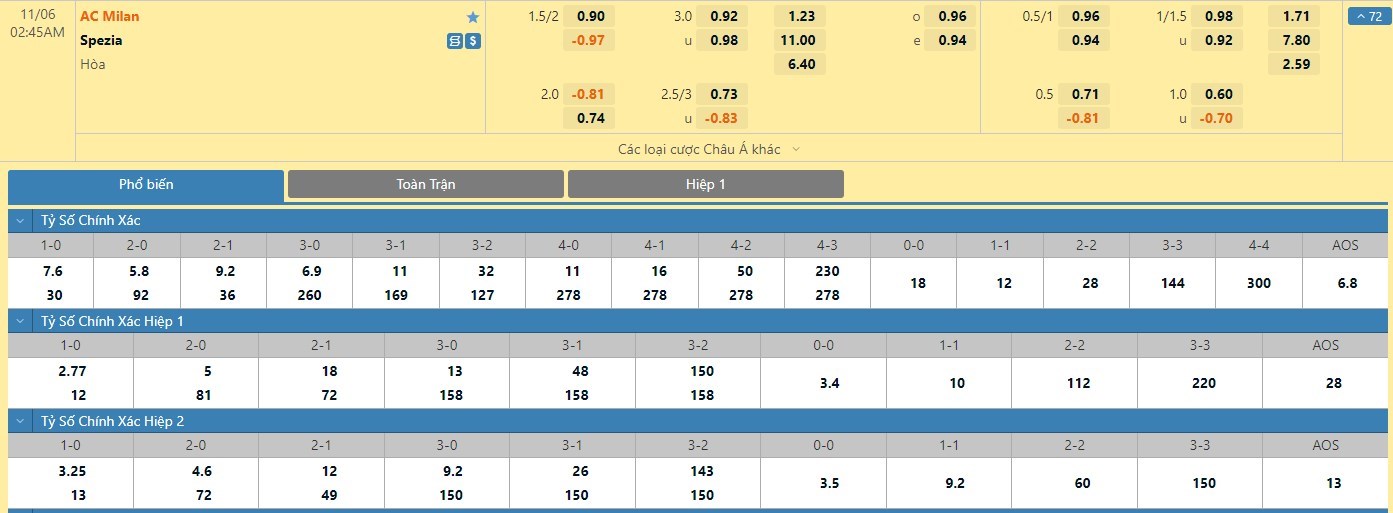 Tip kèo tỷ số hiệp 1: AC Milan 1-0 Spezia