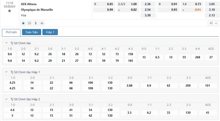 Tip kèo tỷ số hiệp 1: AEK Athens 1-1 Marseille