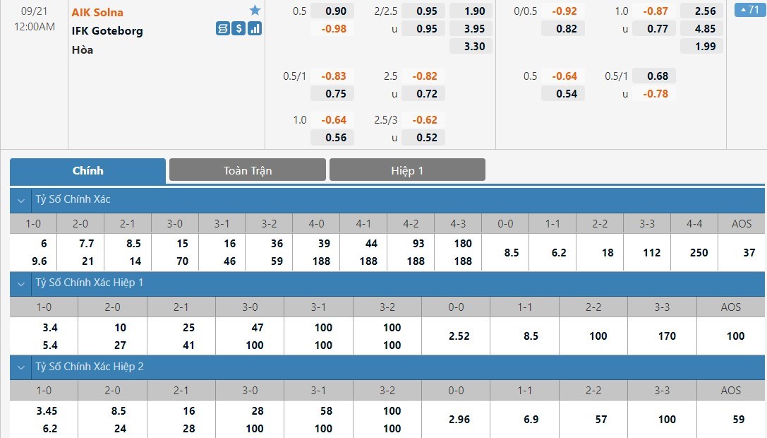 Tip kèo tỷ số hiệp 1: AIK Solna 0-0 IFK Goteborg