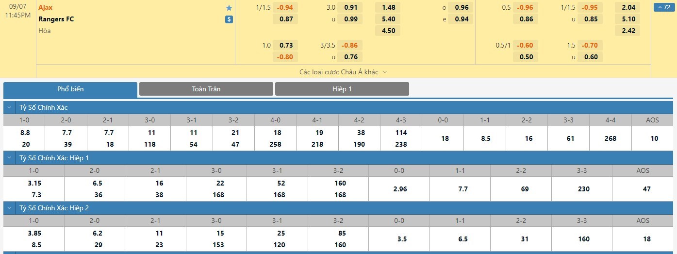 Tip kèo tỷ số hiệp 1: Ajax 1-0 Rangers
