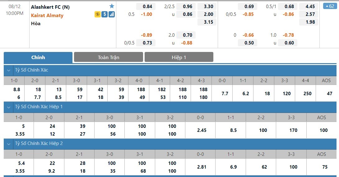 Tip kèo tỷ số hiệp 1: Alashkert FC 0-0 Kairat Almaty