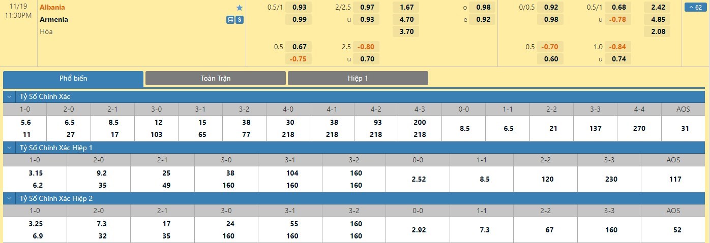 Tip kèo tỷ số hiệp 1: Albania 1-1 Armenia