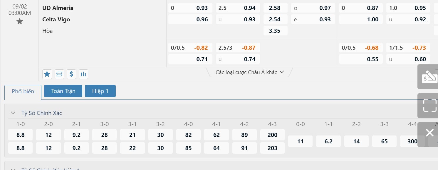 Nhà cái đưa ra mốc tỷ lệ đồng banh cho cặp trận giữa Almeria và Celta Vigo. Với phong độ nghèo nàn của cả hai đội thì thật sự đây là cặp trận cân sức và khó đoán định kết quả. Lần gần nhất hai đội gặp nhau, họ đã bất phân thắng bại với tỷ số hòa 2-2. Điểm đáng chú ý là những cuộc đọ sức giữa hai đội bóng này thường có xu hướng xuất hiện nhiều bàn thắng. Cụ thể, 4/5 màn chạm trán gần nhất giữa Almeria và Celta Vigo có từ 3 bàn trở lên.