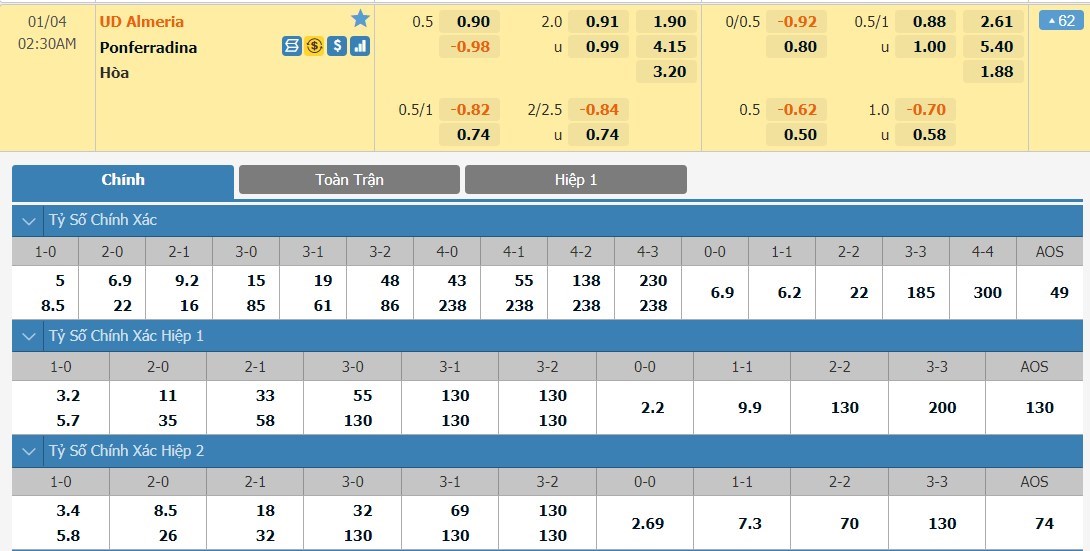 Tip kèo tỷ số hiệp 1: Almeria 1-1 Ponferradina