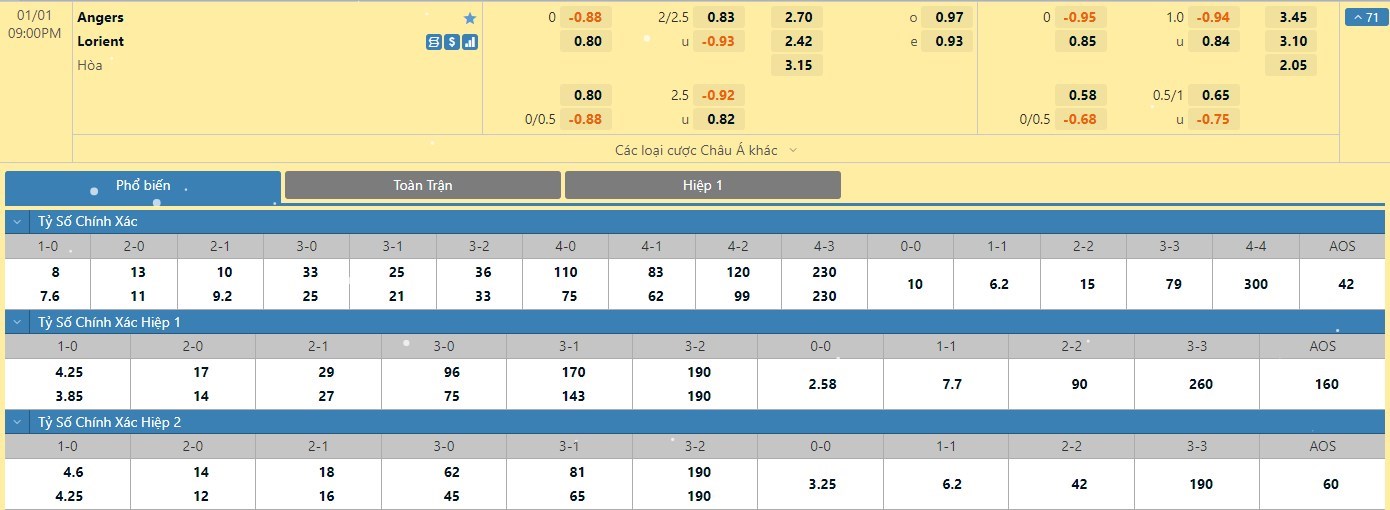 Trong 5 trận đấu gần nhất đôi bên đụng độ nhau trực tiếp, Angers chỉ có 1 trận đấu mang về được cho mình ít nhất là 1 bàn thắng trong hiệp đấu đầu tiên. Còn với Lorient, đội bóng này cũng chỉ có 1 lần làm được điều này trong 45 phút đầu tiên. Với kèo hiệp 1 thì người chơi nên tin tưởng vào kết quả hai đội cầm hòa nhau trong 45 phút đầu trận này. Ở 5 lần đối đầu trực tiếp nhau thì đã không có trận đấu nào kết thúc với tổng số bàn thắng từ 3 trở lên. Các nhà đầu tư nên tin tưởng vào khả năng nổ Xỉu ở cuộc đối đầu này với tỷ lệ tài xỉu là 2 1/4 trái.