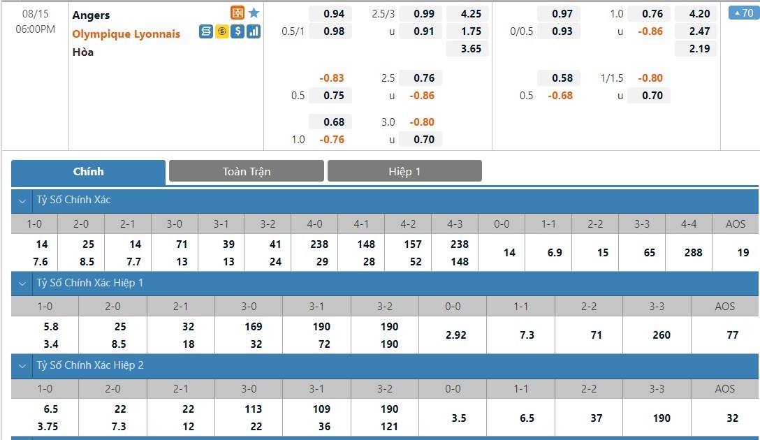 Tip kèo tỷ số hiệp 1: Angers 1-1 Lyon