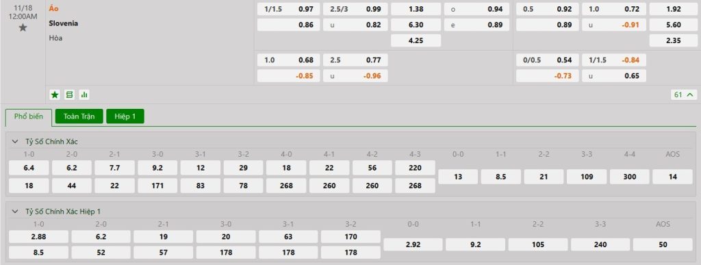 Tip kèo tỷ số hiệp 1: Áo 0-0 Slovenia