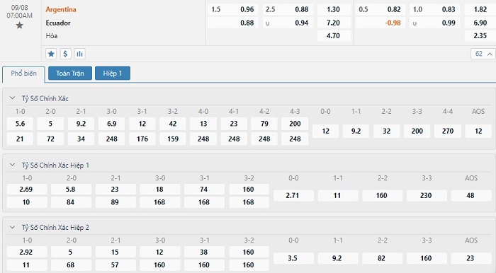 Tip kèo tỷ số hiệp 1: Argentina 2-0 Ecuador