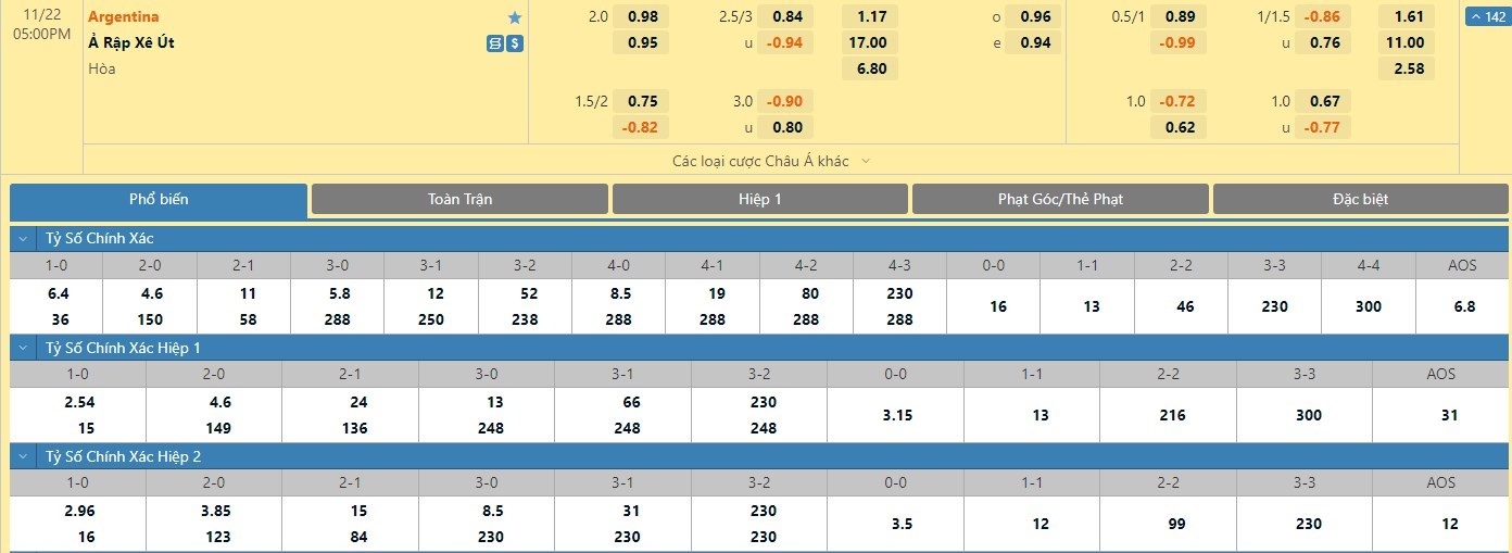 Tip kèo tỷ số hiệp 1: Argentina 1-0 Saudi Arabia
