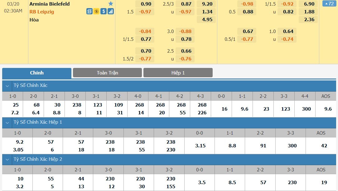 Tip kèo tỷ số hiệp 1: Arminia Bielefeld 0-1 RB Leipzig