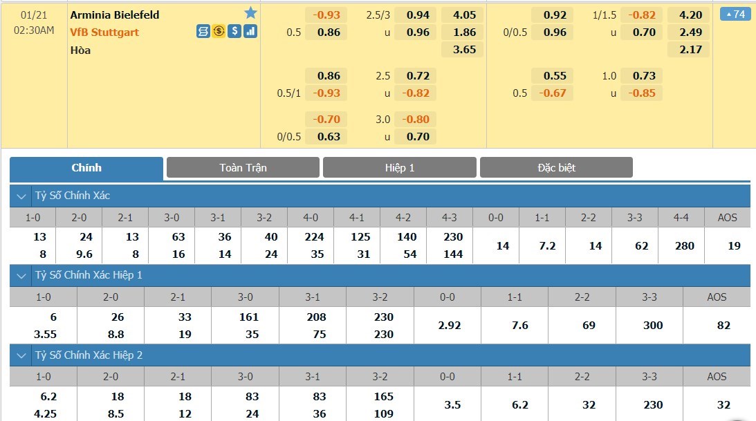 Tip kèo tỷ số hiệp 1: Arminia Bielefeld 0-1 VfB Stuttgart