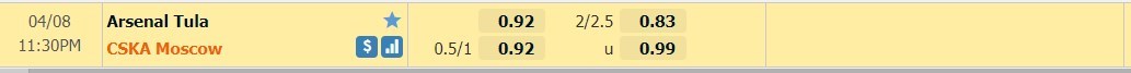 Arsenal Tula là đội bóng để thủng lưới nhiều thứ nhì tại giải quốc nội mùa này với trung bình tới 1.75 bàn/trận. 5 trận đấu gần nhất họ đều để thua từ 2 bàn trở lên, thêm nữa, 3/5 trận gần nhất họ đều rơi vào kèo Tài. Ở bên kia chiến tuyến, CSKA Moscow có hơn 50% số trận mùa này có từ 3 bàn thắng trở lên. Mỗi trận đấu có sự xuất hiện của họ, số bàn thắng trung bình là 2.8. 3 trận đấu gần đây nhất đều kết thúc với kèo Tài.
